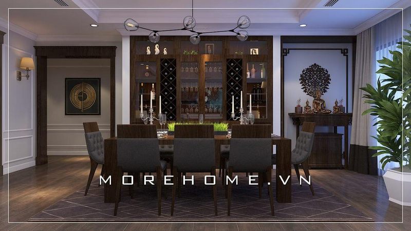 Chiêm ngưỡng mẫu thiết kế nội thất chung cư hiện đại gỗ tự nhiên với bộ bàn ăn gỗ óc chó đệm vải độc đáo kêt hợp tủ gỗ trưng bày rượu sang trọng