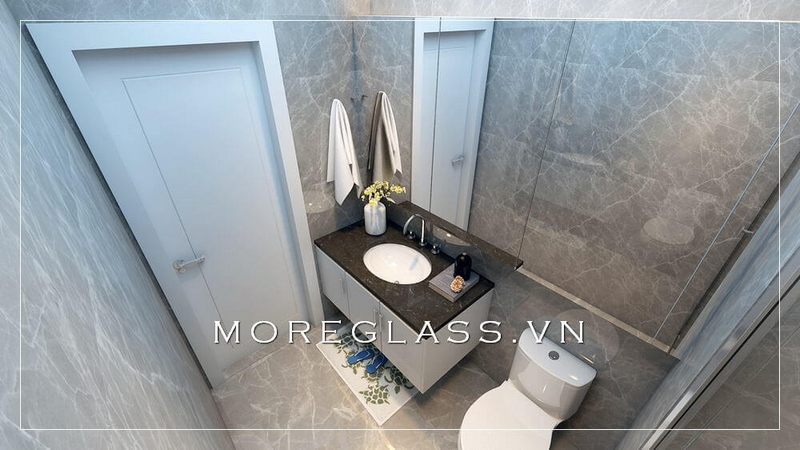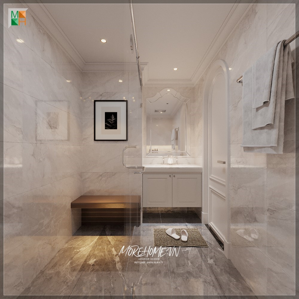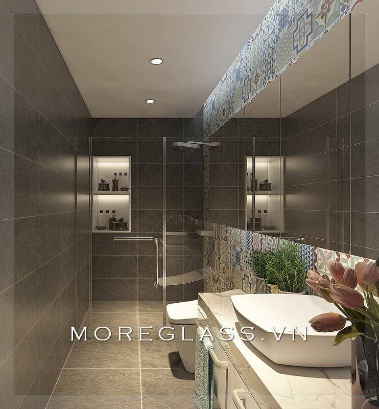 Do chiều rộng của phòng tắm hạn chế, KTS đã khéo léo trong việc bố trí nội thất và khu vực để tạo ra một căn phòng tắm hiện đại và thoáng đãng.