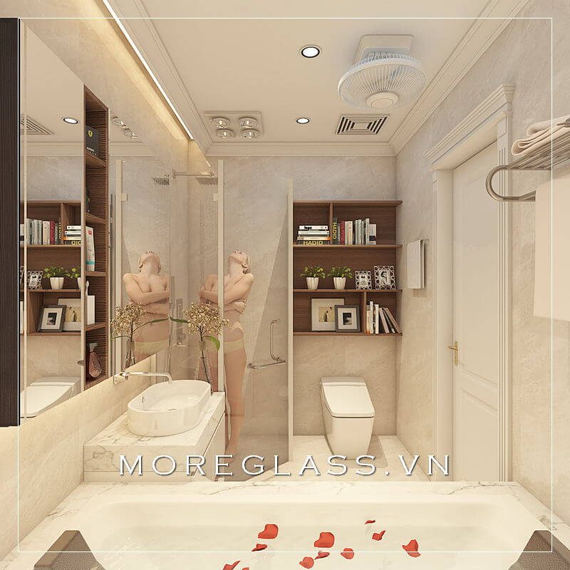 Thiết kế phòng tắm nhà phố đẹp, đủ tiện nghi và sử dụng gạch men sáng bóng để ốp lại phòng tắm, giúp tạo cảm giác rộng rãi hơn.