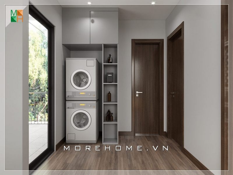Tủ kệ đựng đồ trong phòng giặt của nhà phố có nắp ngăn giúp người nội trợ làm việc thuận tiện hơn.