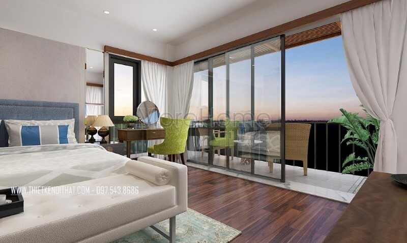 Phòng ngủ biệt thự hiện đại, thông thoáng và sang trọng được thiết kế bằng cách sử dụng cửa kính cường lực lớn, giúp bạn có thể tận hưởng cảm giác trong lành và ngắm nhìn về vẻ đẹp tuyệt vời của thiên nhiên chính từ giường ngủ của mình.